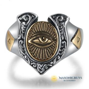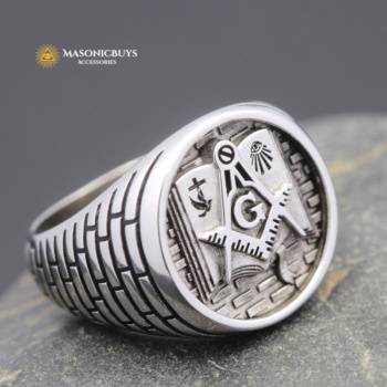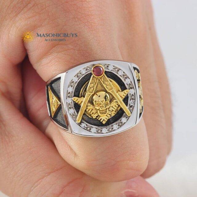 Fancy Masonic Silver Ring With a Skull & Crossbone And Red Stone.